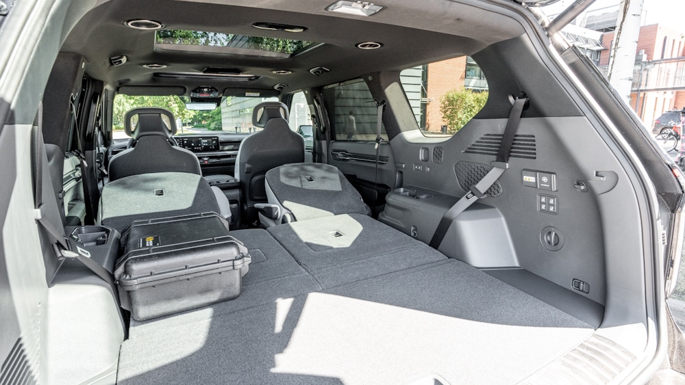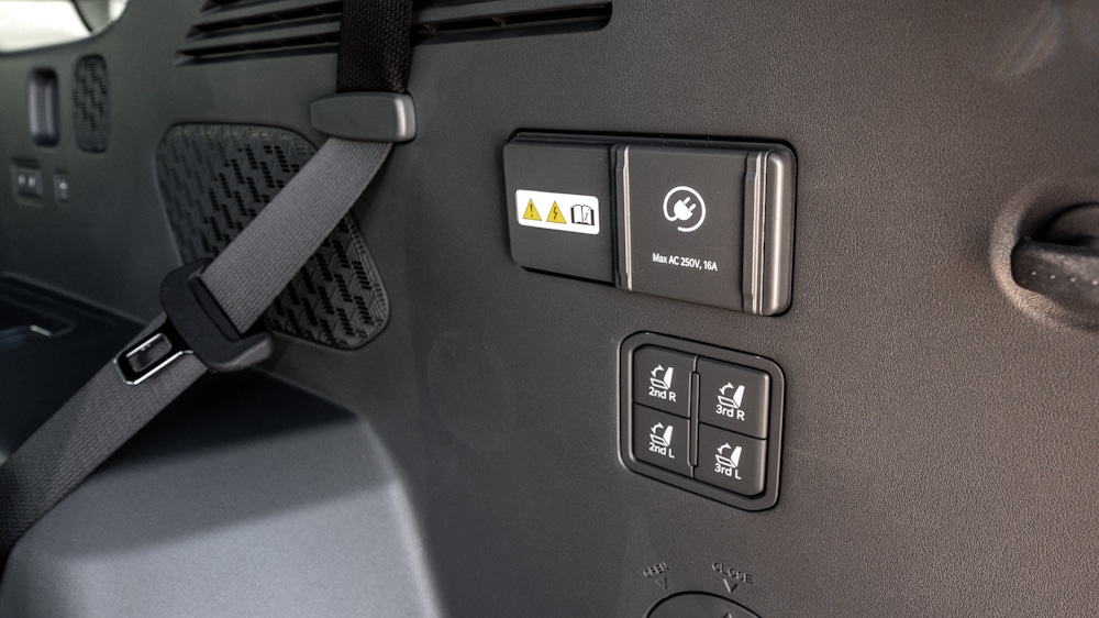 In addition to the traditional mirror, the EV9 has a camera mounted at the top of the tailgate as a rear-view mirror. The view from the camera is not as bright and clear as from a conventional mirror. With a normal mirror, the seats and headrests are in the way. The camera view is clearly different from a normal mirror view, but like the graphics, you quickly get used to the angle of view of a digital mirror.