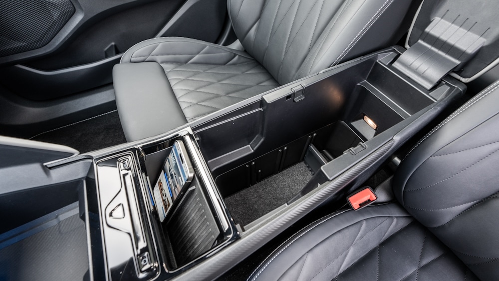 The centre screen can be tilted by sliding the bottom edge, making the experience more ergonomic to your liking. When closest to the horizontal plane, it’s easy to hide things behind the screen. The centre console has a wireless charging station for one phone.