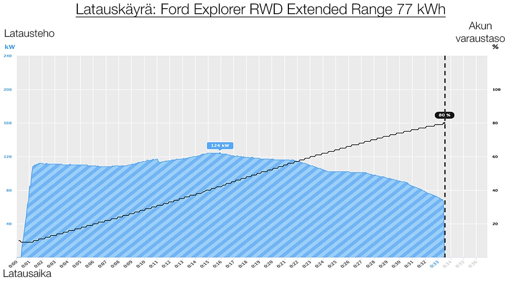 With the larger Extended Range battery, the available battery capacity is 77 kWh in the test-driven rear-wheel drive model and 79 kWh in the four-wheel drive model. The range was completed at the end of the year with the rear-wheel drive Standard Range model with a capacity of 52 kWh. Based on the test-drive week’s consumption in temperatures of a few degrees and in mixed driving, the Explorer can cover just over 400 km on a single charge with the larger battery.